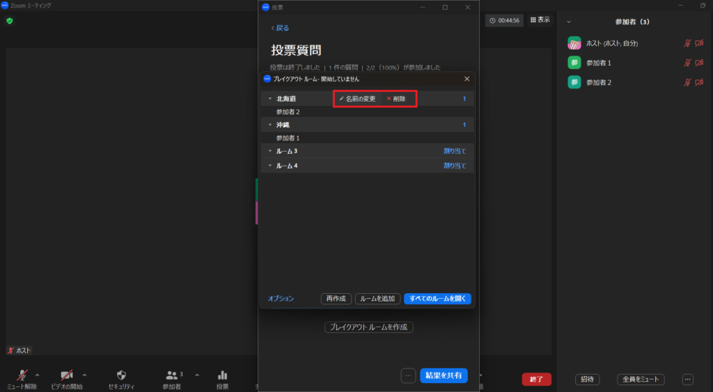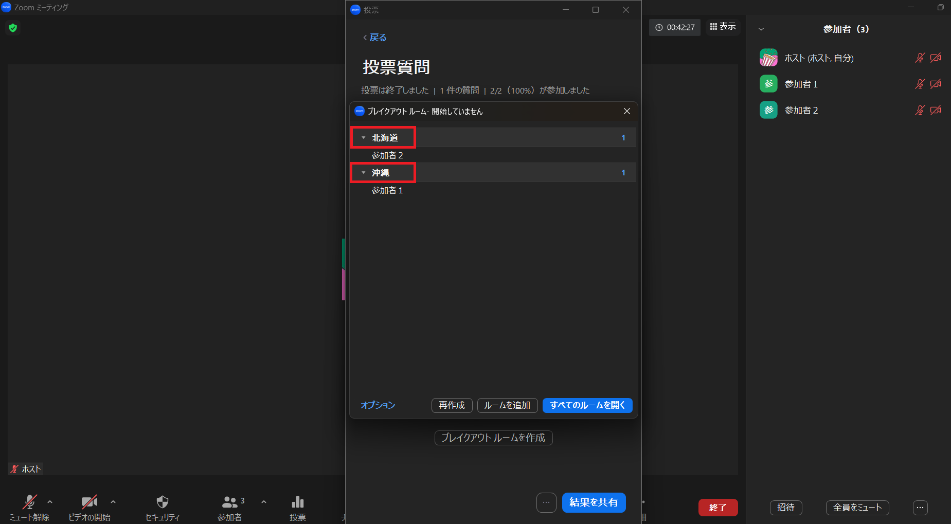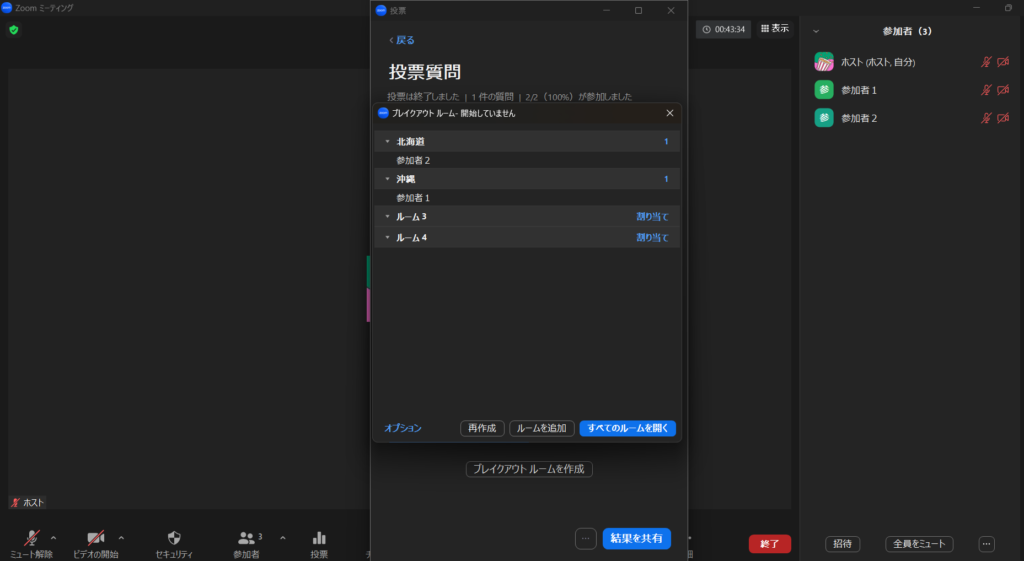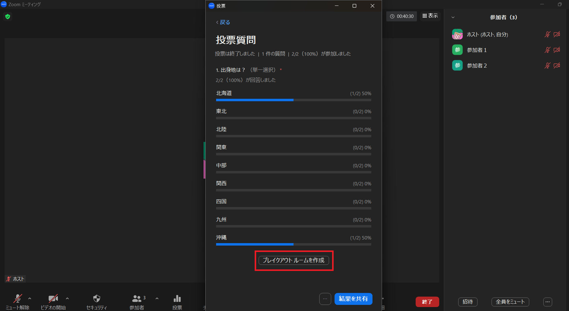 3.参加者の投票が終了後、結果の下にある「ブレイクアウトルームを作成する」をクリック