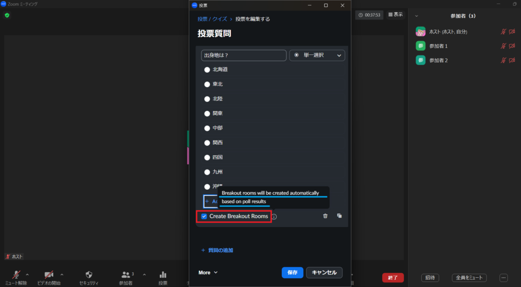 2.Zoomミーティング中に「投票」から「単一選択」の質問作成、「Create Breakout Rooms」にチェックを入れて、参加者に公開する。
