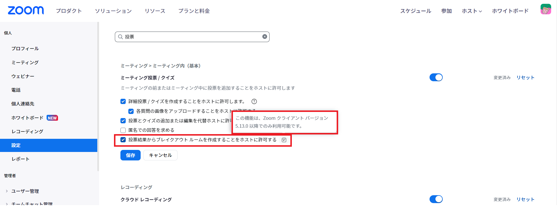 1.バージョンが満たされている状態で、ブラウザ版にログインし、「投票結果からブレイクアウト ルームを作成することをホストに許可する」にチェックを入れる