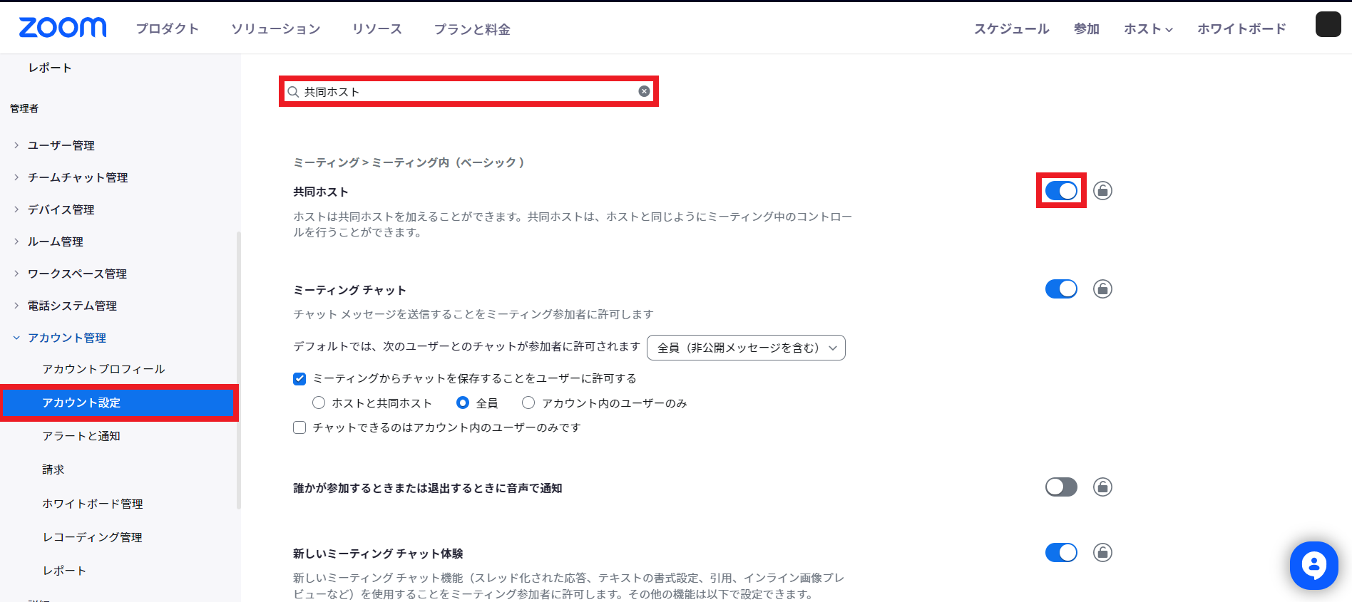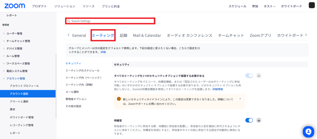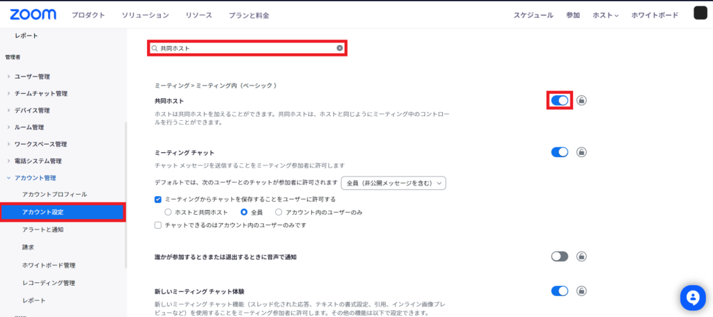 2.「アカウント設定」で「ミーティング」タブに切り替え、Search Settingまたはコマンド+Fにて「共同ホスト」と検索