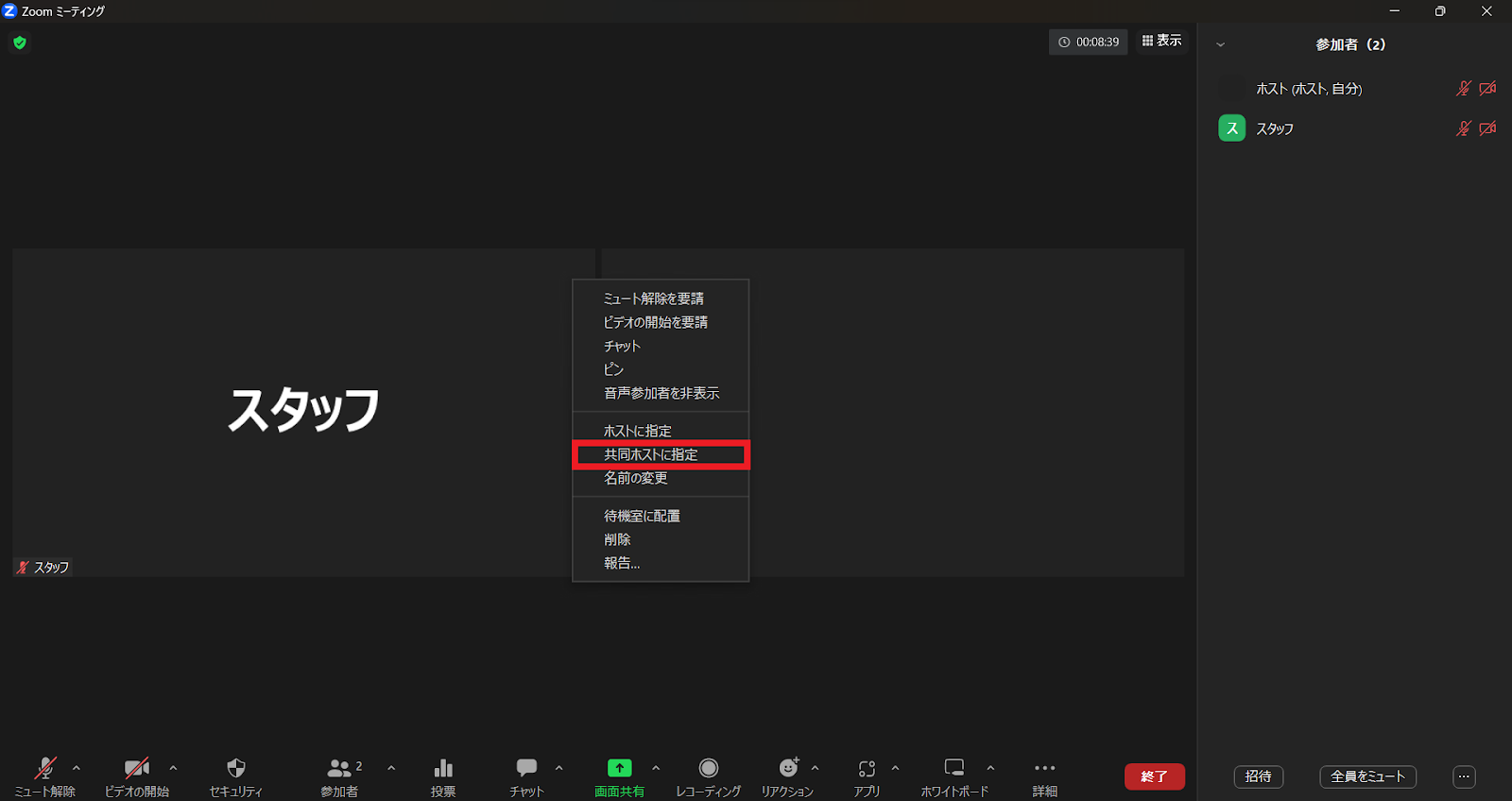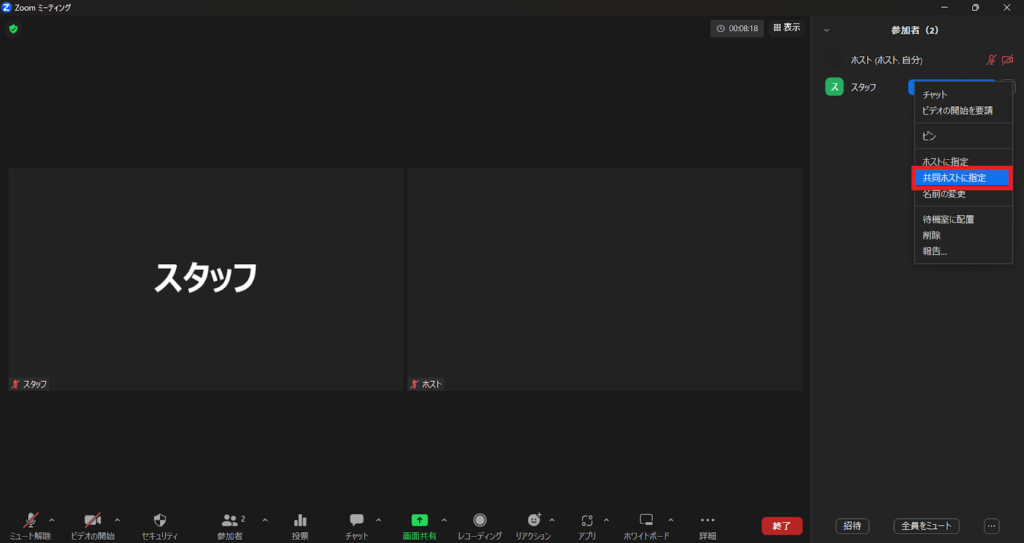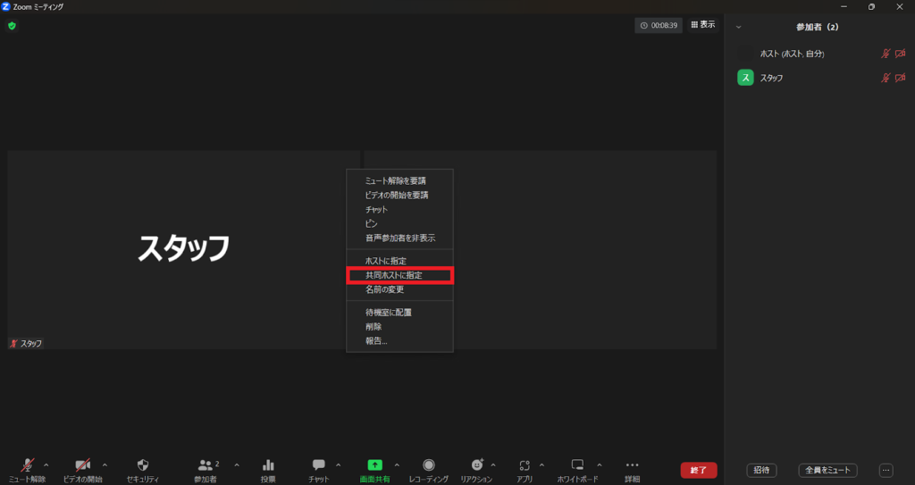 4.Zoomミーティングにて「共同ホスト」を付与する