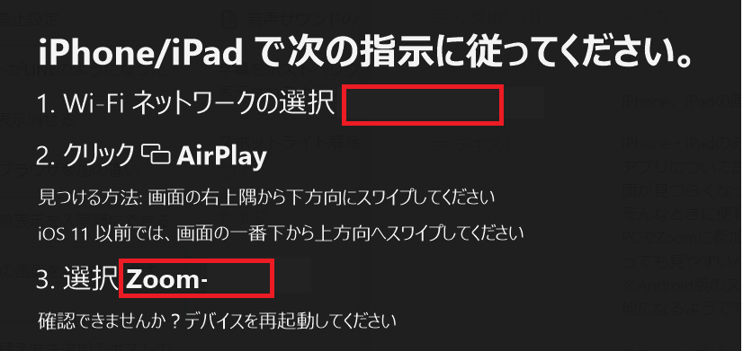 ①Zoomに参加しているデバイス(PC)と共有したいiPhone/iPadとWi-Fiを同じものを接続しておきます