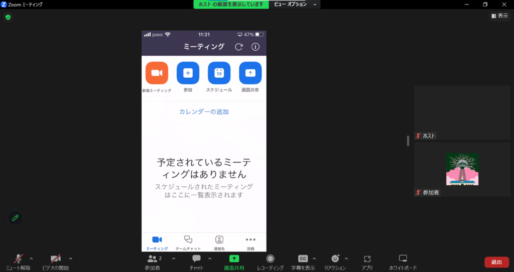 準備していないと、ホーム画面から操作している最中も参加者に画面が見えてしまいます。