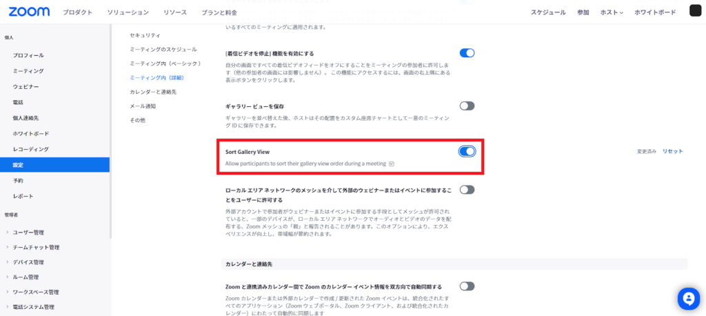 ②「ミーティング内(詳細)」にある「Sort Gallery View」をオンにする