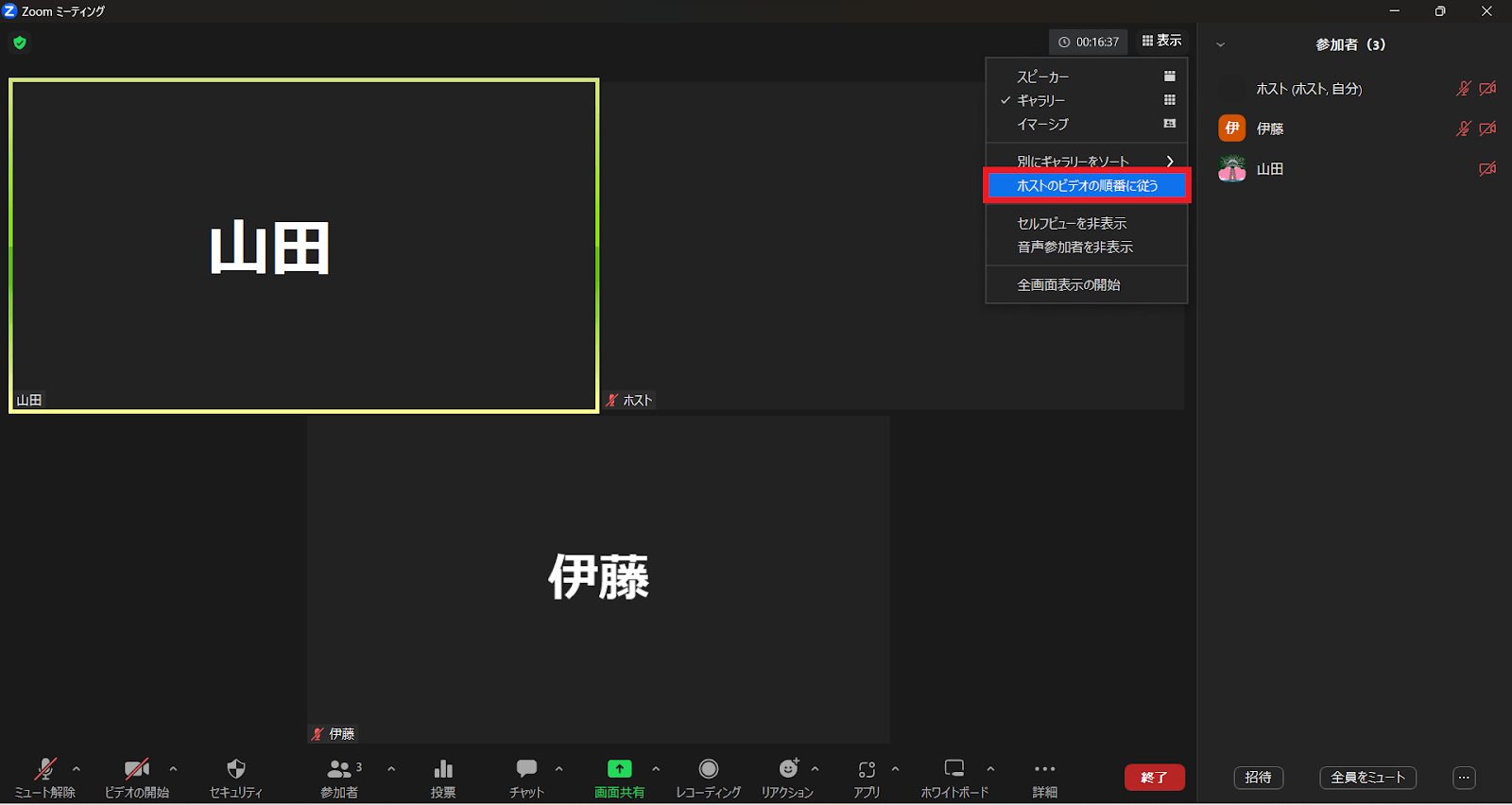 次に、先ほどの「表示」から見えた方もいらっしゃるかもしれませんが、並べ替え機能でもうひとつご紹介したいのが「ホストのビデオの順番に従う」。こちらは、ホストのギャラリービュー画面に参加者のギャラリービュー画面をそろえる機能です。