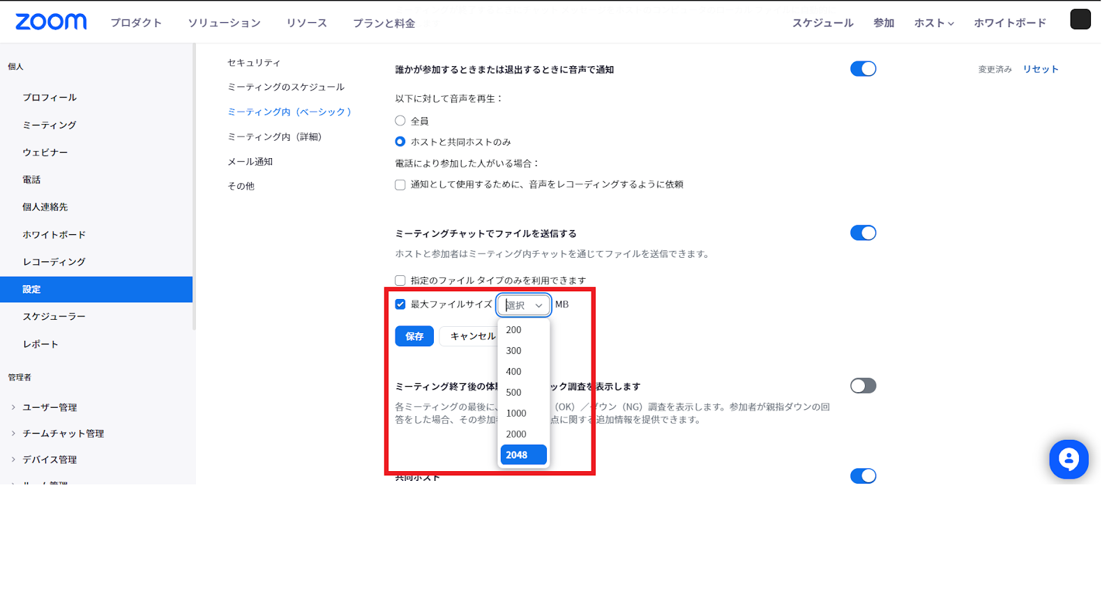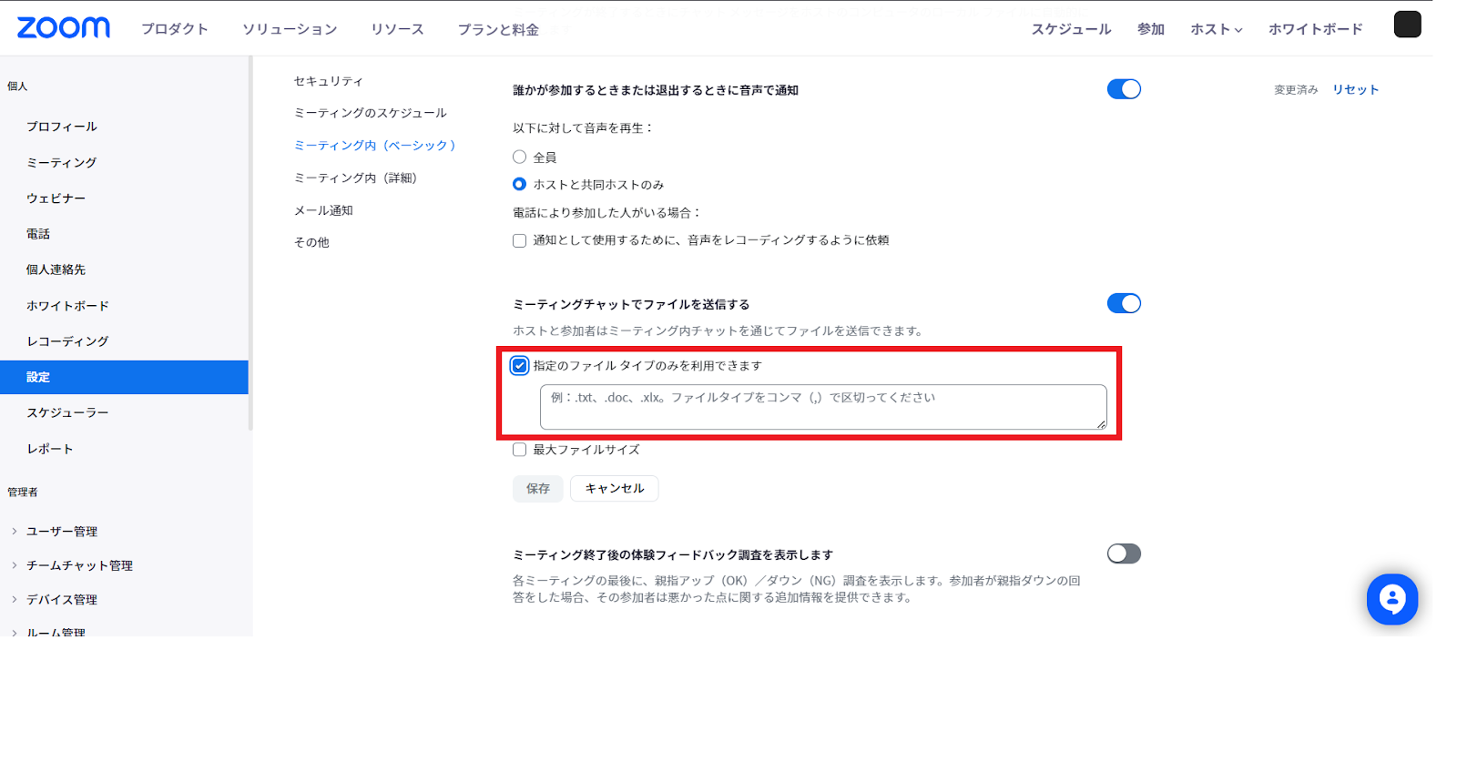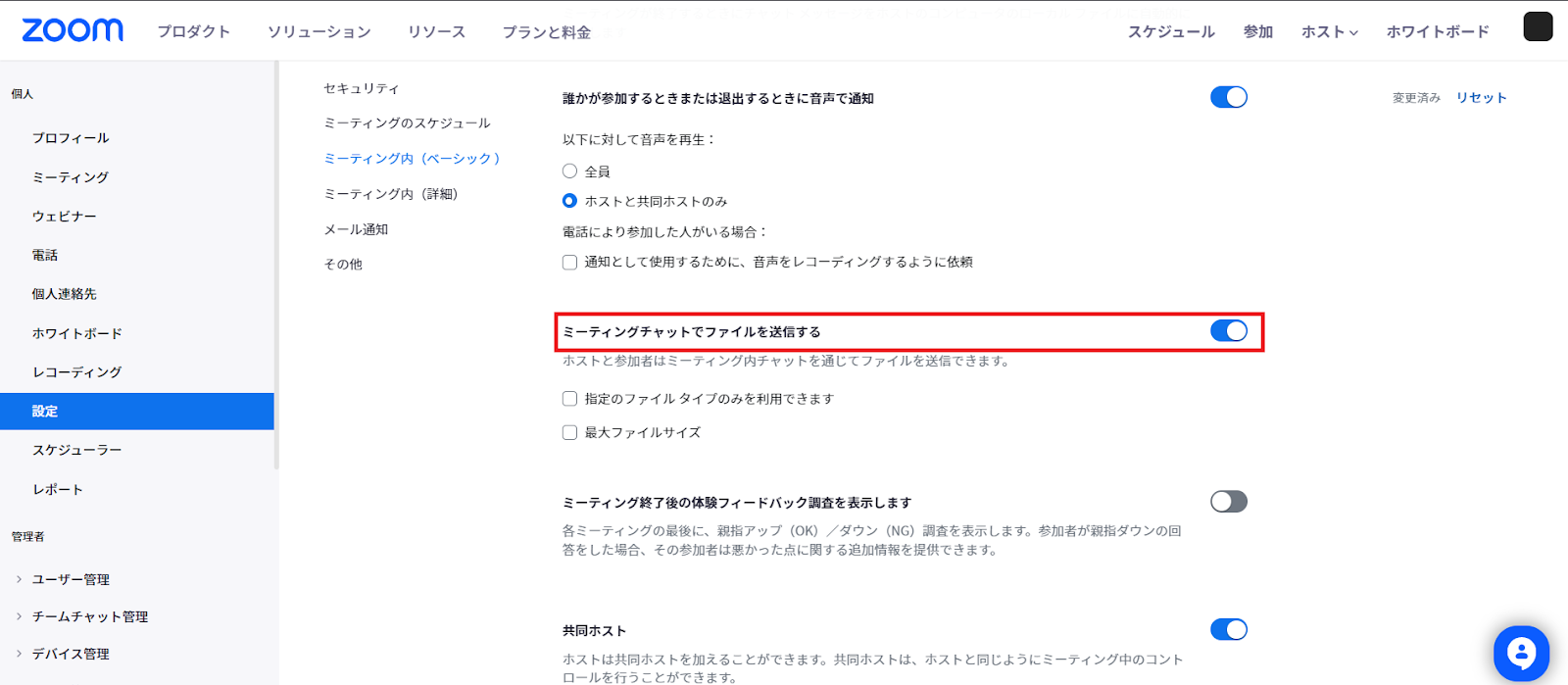 ブラウザ版にログインし、「ミーティングチャットでファイルを送信する」がオンになっているか確認しましょう。