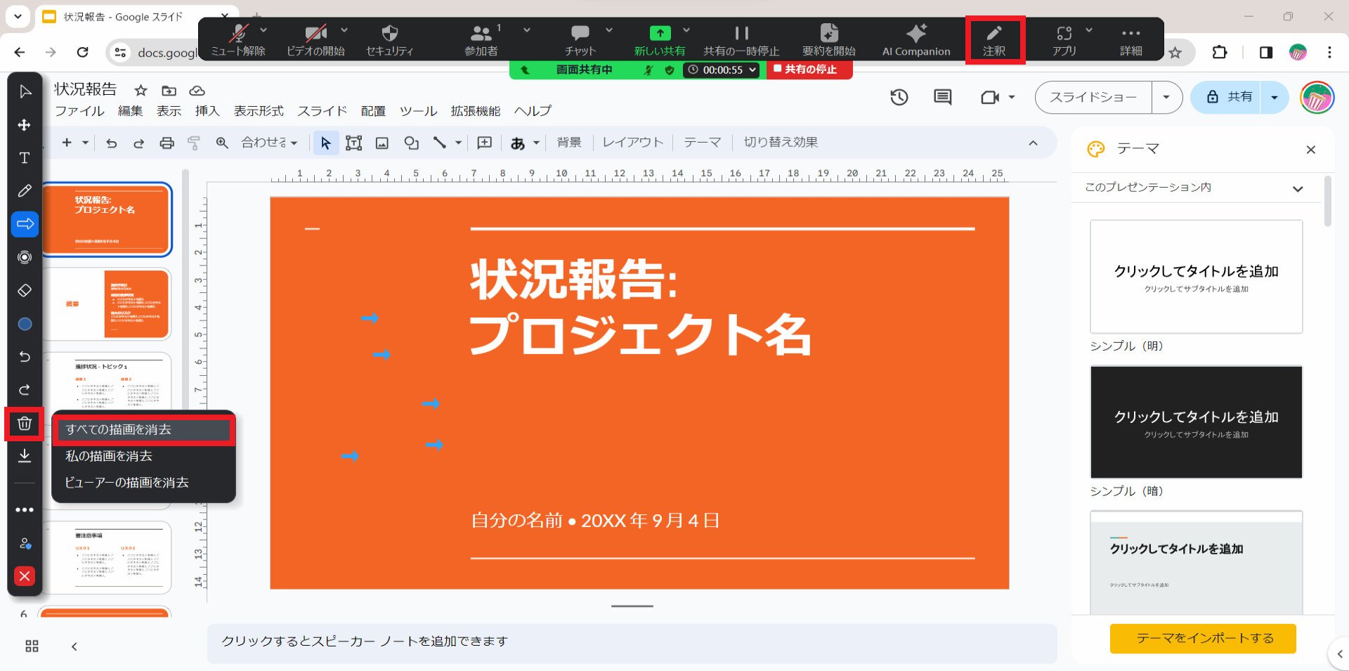 この機能を知っておくと、参加者自身が消す手間を省けますし、時間の短縮にもつながります。参加者が余計なことに気を取られることなく、プレゼンテーションの内容に集中できるようになるのです。