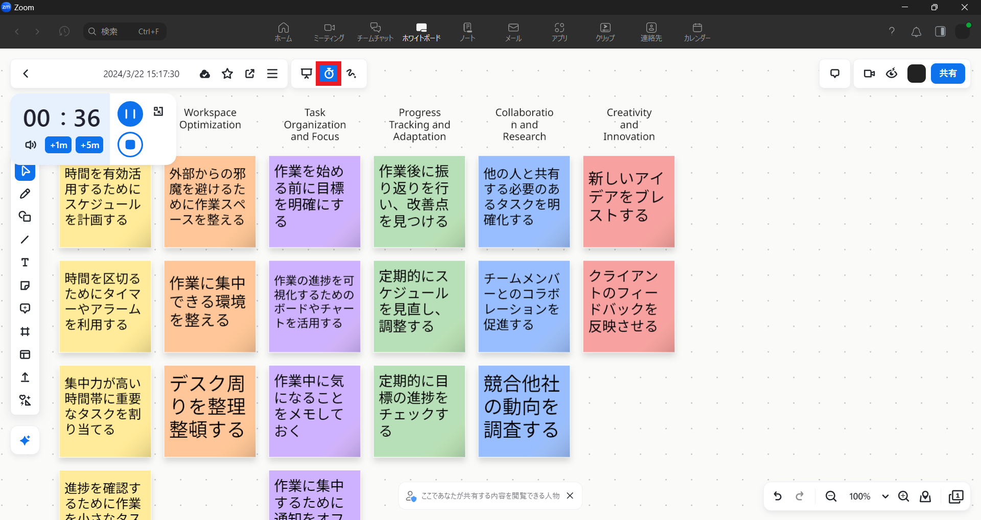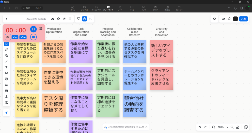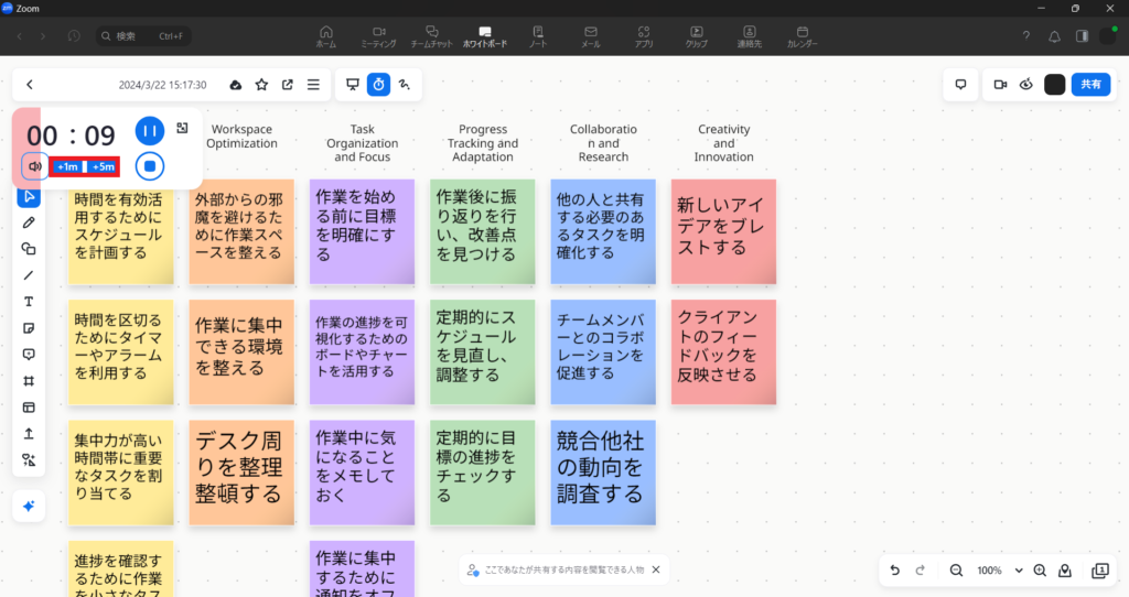 ブレイクアウトルームの残り時間は表示が小さいこともありますので、ホワイトボードを使う際にはこの機能を使うとよさそうです。