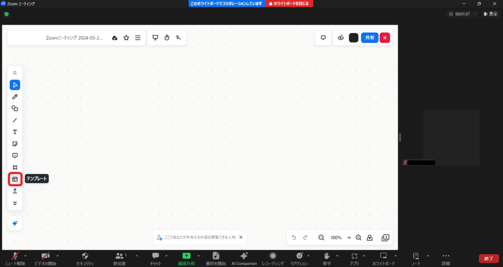 Zoomミーティング中にホワイトボードのテンプレートを使用する場合は、ひとつステップが増えます。「ホワイトボード」をクリックし、左にあるツールバーから「テンプレート」をクリックして利用します。