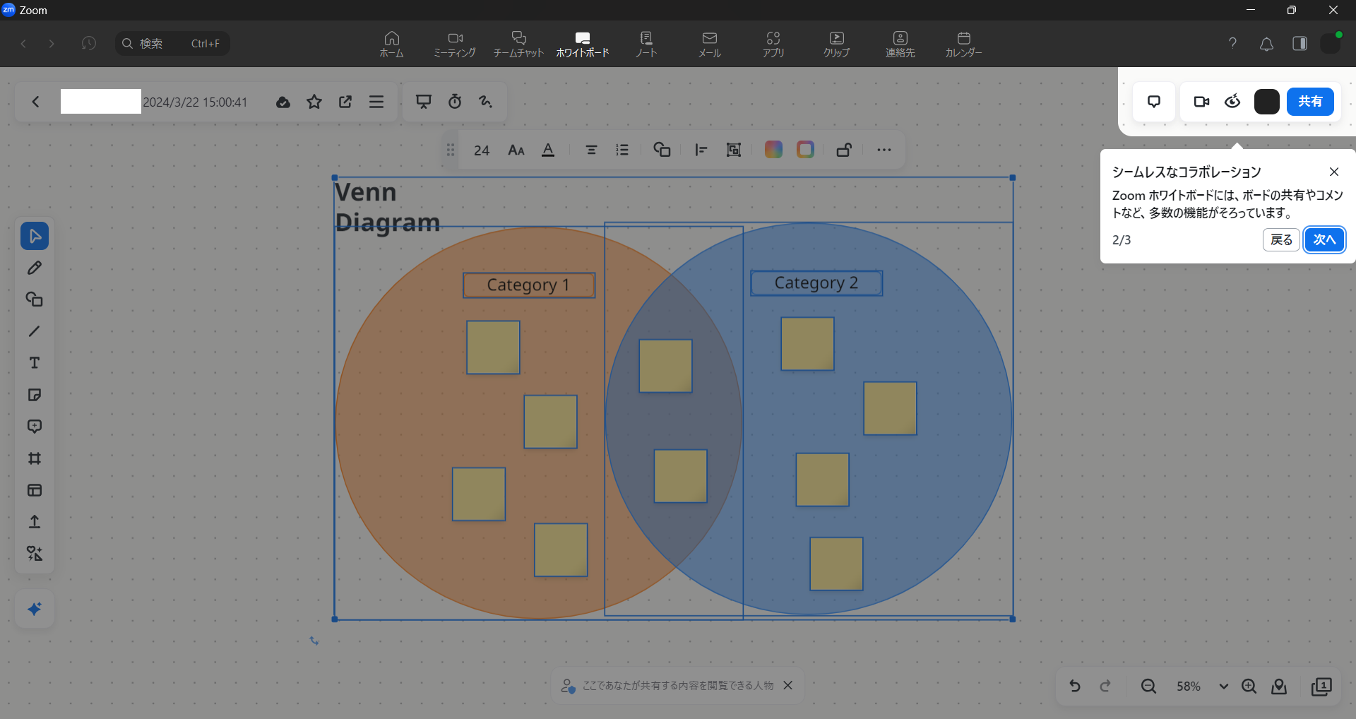 ホワイトボードの共同編集中は、参加者がリアルタイムで行った変更や追加した内容が、全員の画面に即座に反映されます。これにより、アイデアの共有やフィードバックのやり取りがスムーズに行えます。