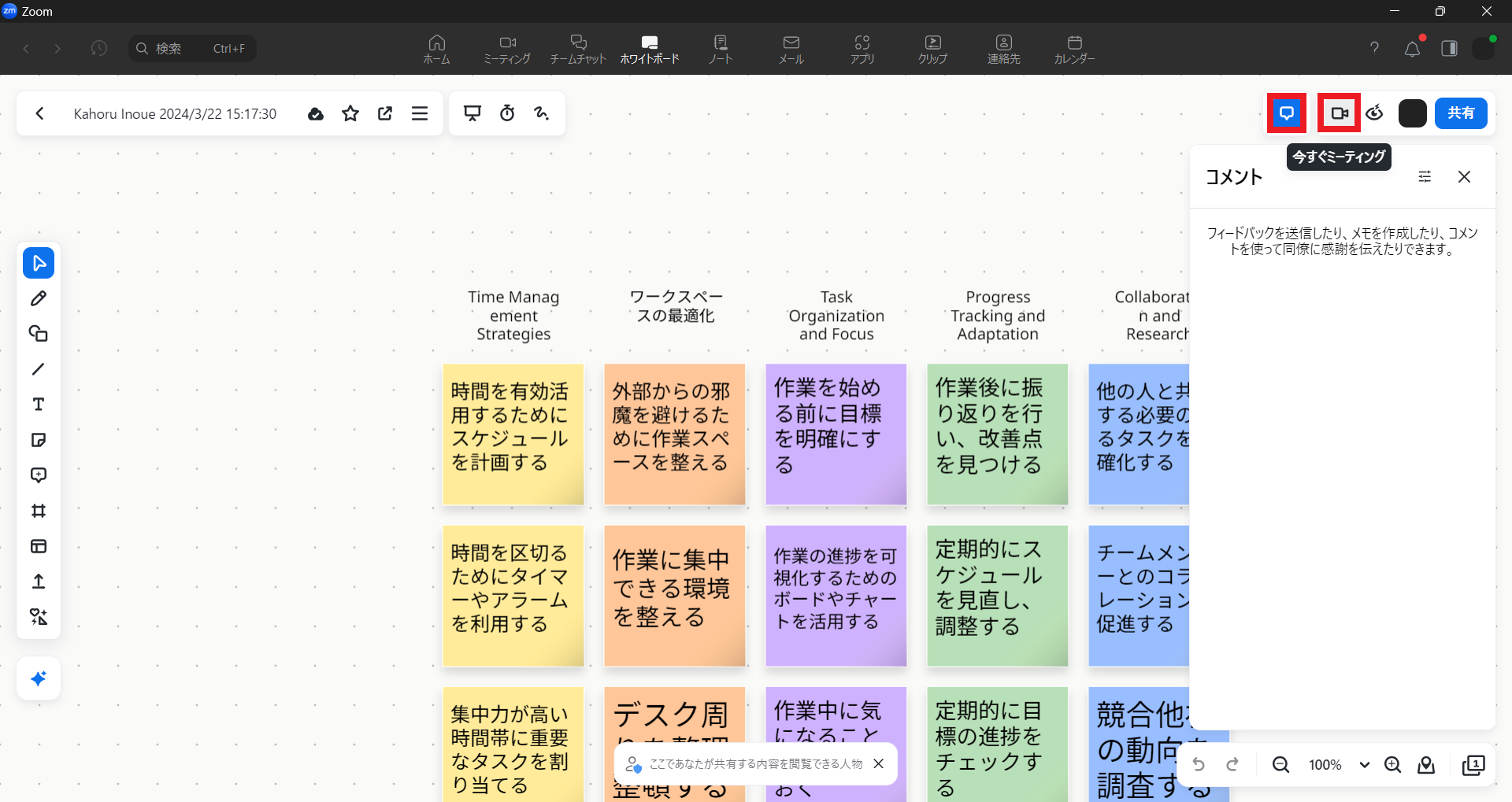 さらに、ホワイトボード上に「ミーティングを開始」ボタンが用意されているため、アイデア出しの後すぐにミーティングを始められます(急にこのボタンで呼び出されると大変そうですが……)。