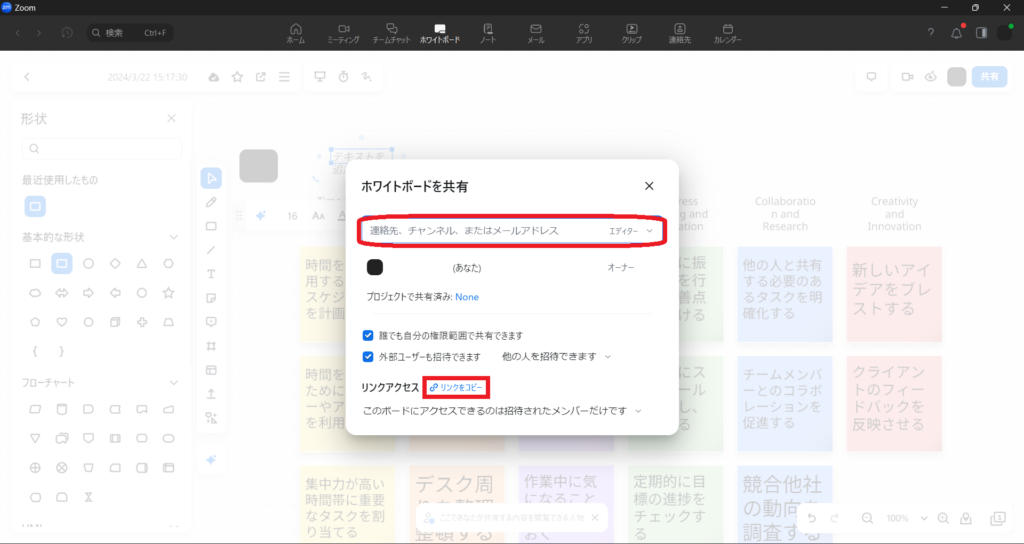 作成したホワイトボードの共有は「共有」ボタンから可能です。