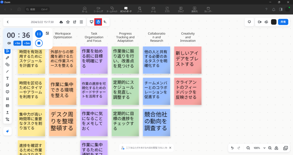 画面左上にある時計マークをクリックすると、タイマーが表示されます。タイマーを使用することで、ディスカッションの時間管理を効率的に進められます。