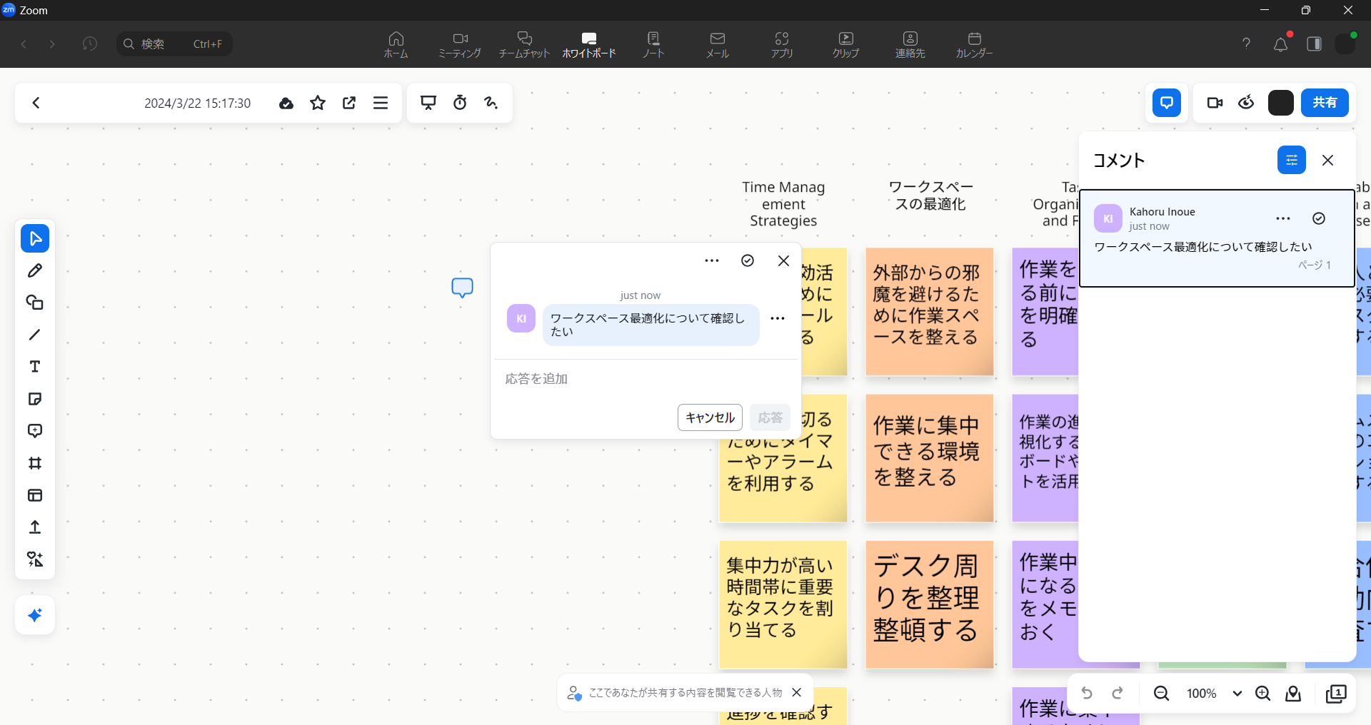 また、ホワイトボード上の特定の場所に直接コメントを追加することができます。