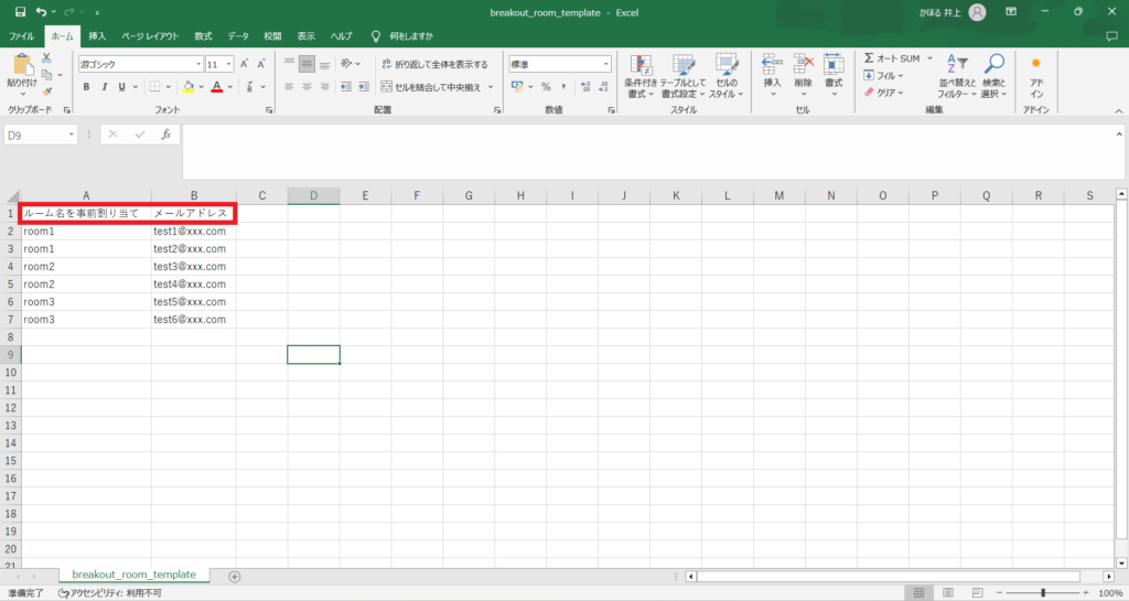 テンプレートをダウンロードし、ルーム名にあわせて参加者のメールアドレスを入力。