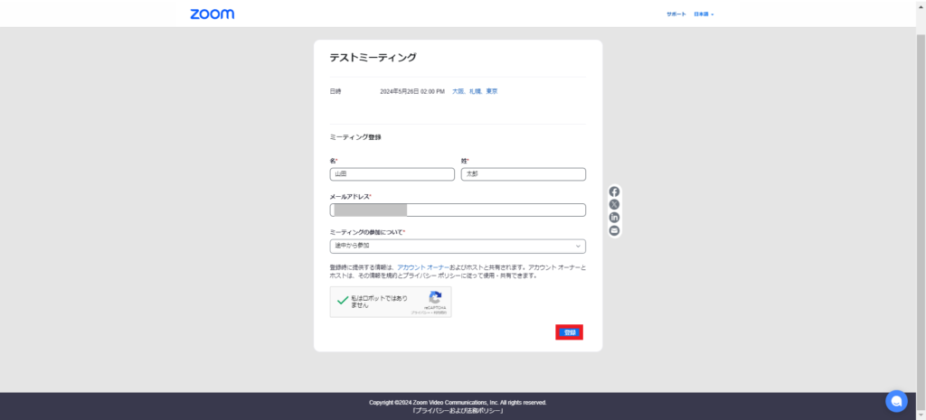 ミーティングの「詳細」にある「登録リンク」を共有するか、