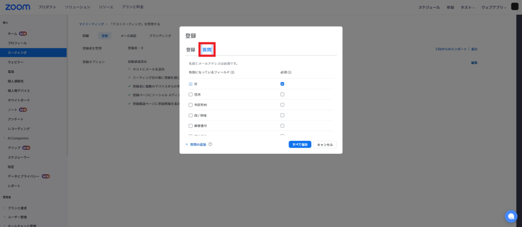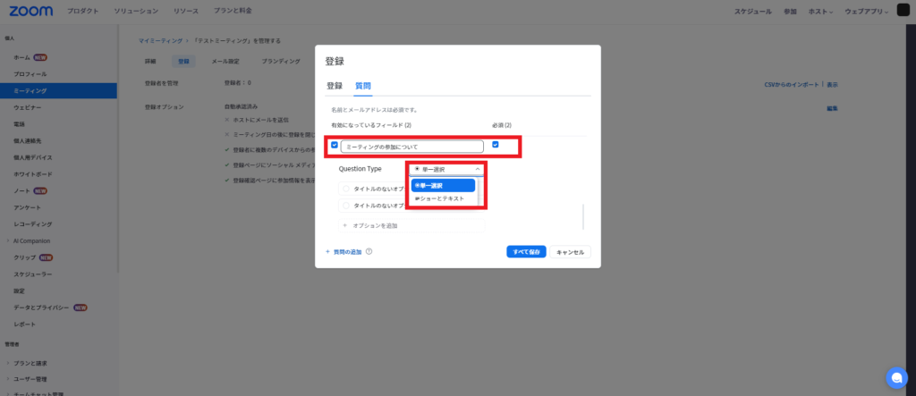 Zoomのミーティングスケジュール画面に事前登録機能が表示されない場合、以下の設定を確認してください。
