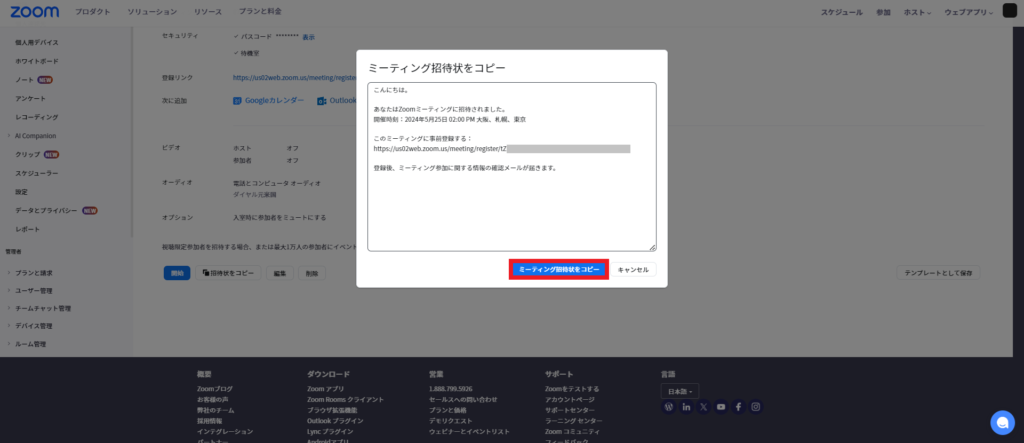 「ミーティング招待状をコピー」からメールなどに貼り付けて送信します。