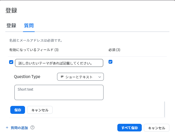 1点気をつけていただきたいのは、質問を追加したら「保存」をクリックすること。質問を保存してから「すべて保存」をクリックしないと、質問が消えてしまいます。