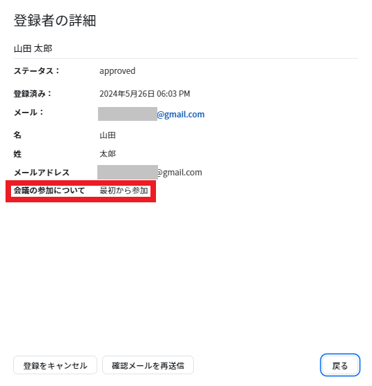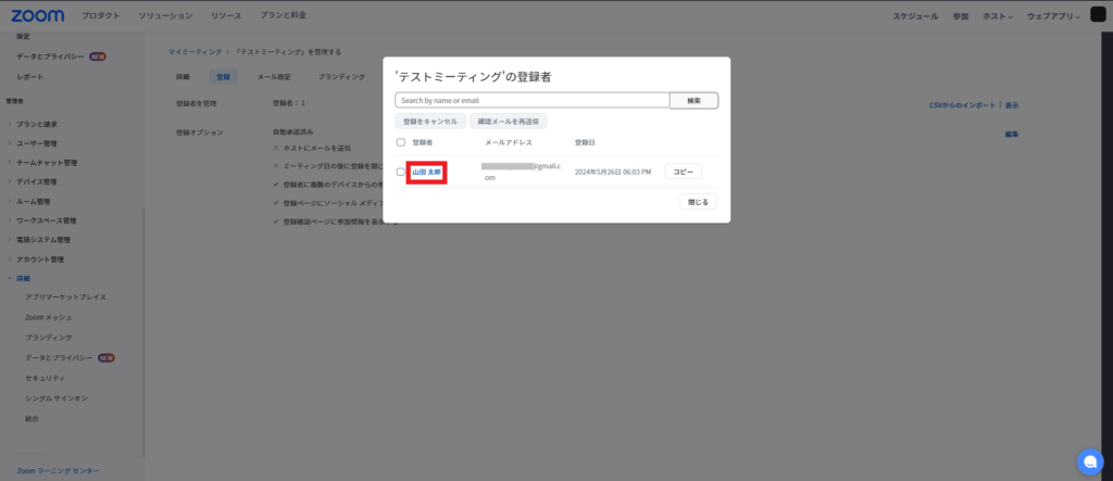 参加者の登録情報は、ミーティングの「登録」から確認ができます。