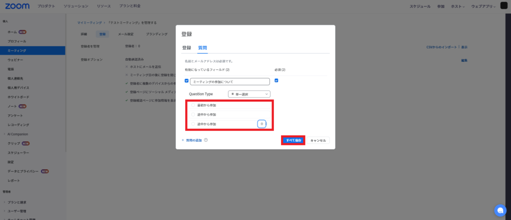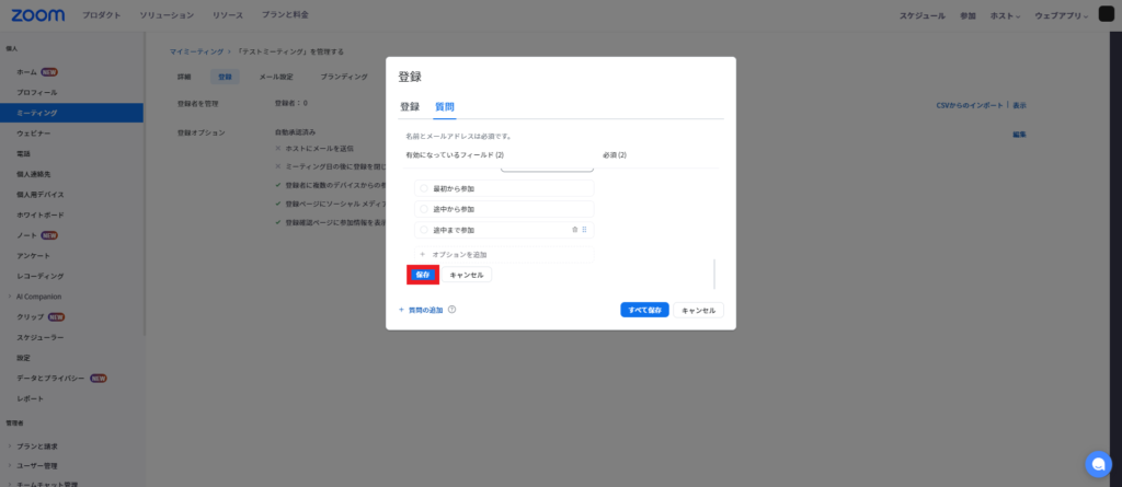「保存」をクリックして、ミーティングの設定を保存します。