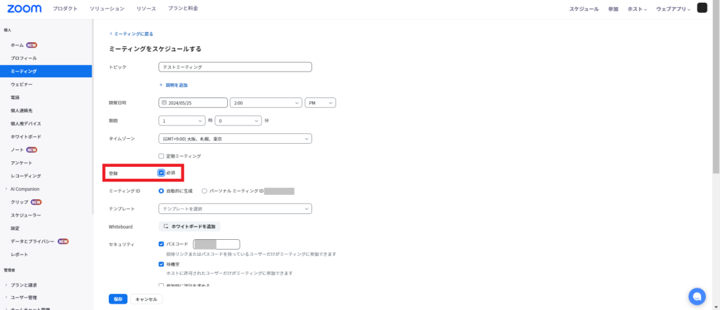 – 「ミーティング」タブをクリックし、「スケジュールミーティング」セクションで「登録(必須)」のオプションが有効になっているか確認します。