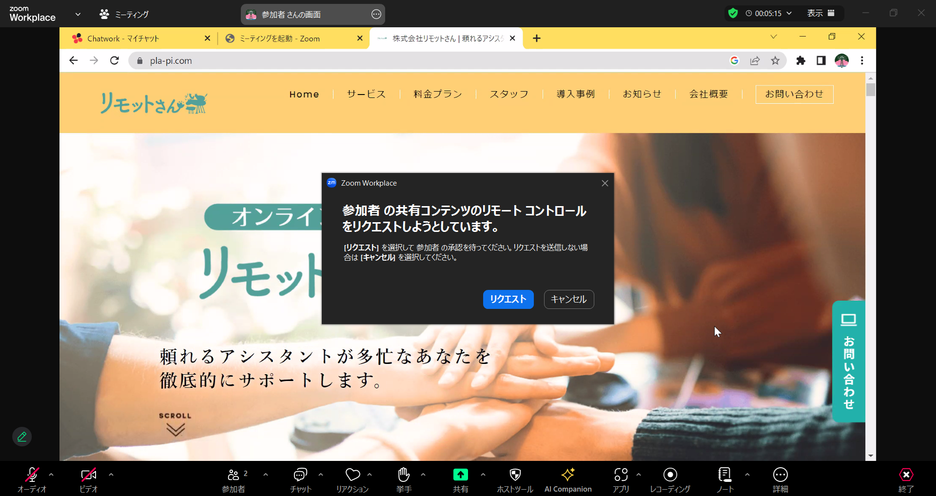 リモートコントロール機能は、共有者がデスクトップ画面を共有すると、その情報が他の参加者に閲覧可能となり、大変便利な反面、慎重に扱う必要があります。