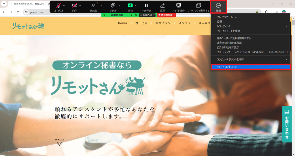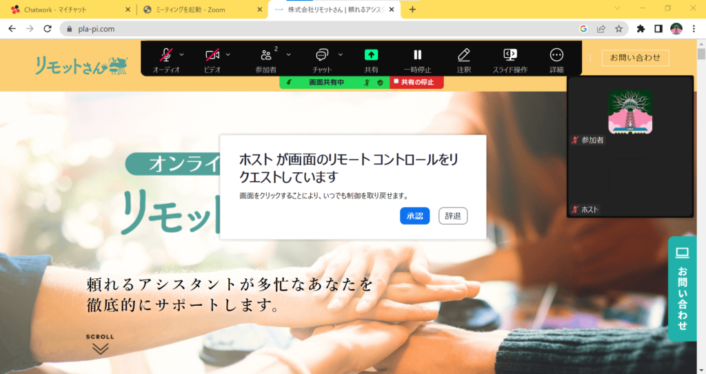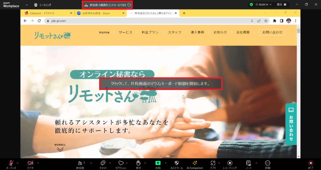 ブラウザ画面の共有であれば、スクロールはもちろん、クリック、タブ移動など、通常の自分の操作と同様のことが行えます。
