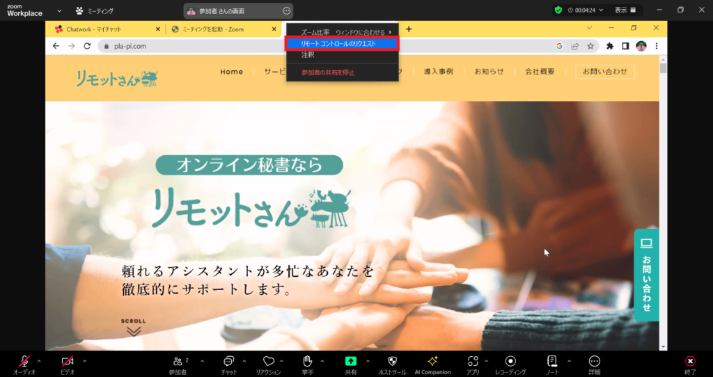 画面共有者がリモートコントロールを付与するには、自分が画面を共有している間に「Remote Control(リモートコントロール)」ボタンをクリックし、操作を許可したい参加者を選択すると、リモート操作が開始されます。