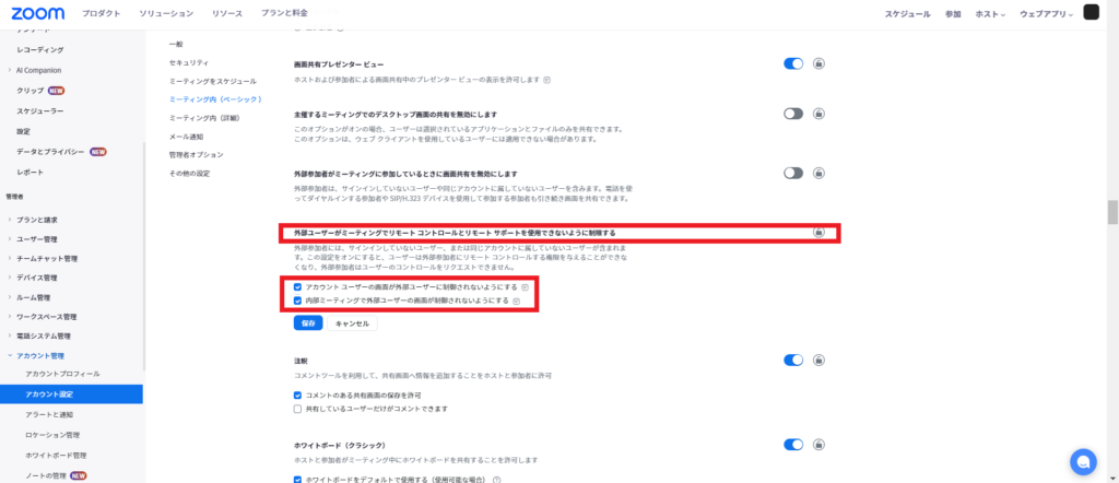 3.「外部ユーザーがミーティングでリモート コントロールとリモート サポートを使用できないように制限する」のロックを外し、制御したいレベルにチェックを入れます。