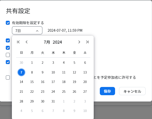 5.「共有設定」ウィンドウで、「有効期限を設定する」にチェックを入れ、適切な日付を選択します。