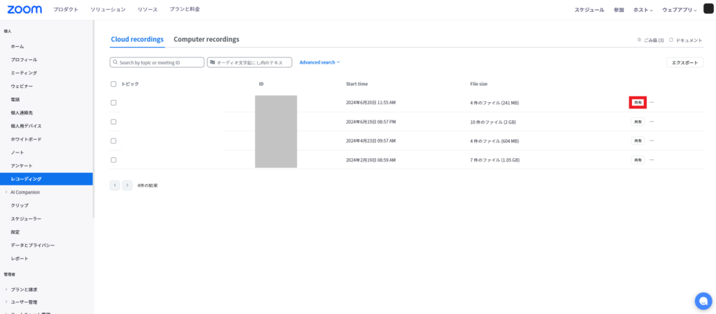 4.共有したいレコーディングの横にある「共有」ボタンをクリックします。