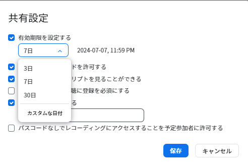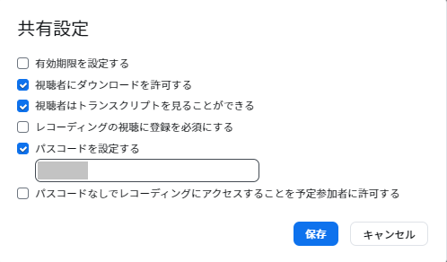 (「パスコードなしでレコーディングにアクセスすることを予定参加者に許可する」にチェックを入れると、共有リンクを受け取った人はパスコード入力なしで直接視聴できるようになります)