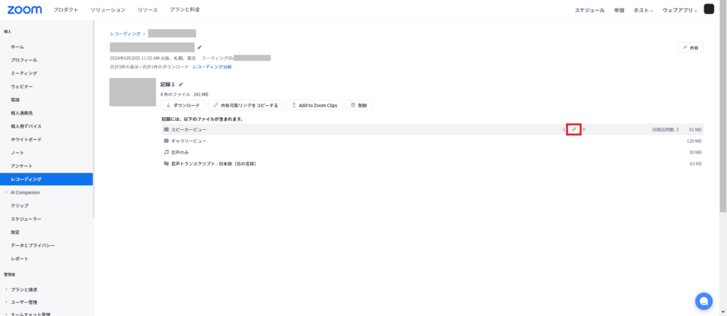 ※特定の視点(スピーカービューなど)のみを共有したい場合、録画のタイトルをクリックし、開いたページで目的のデータリンクをクリックします
