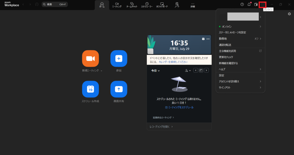 1. Zoomデスクトップアプリより右上のご自身のアイコンをクリック