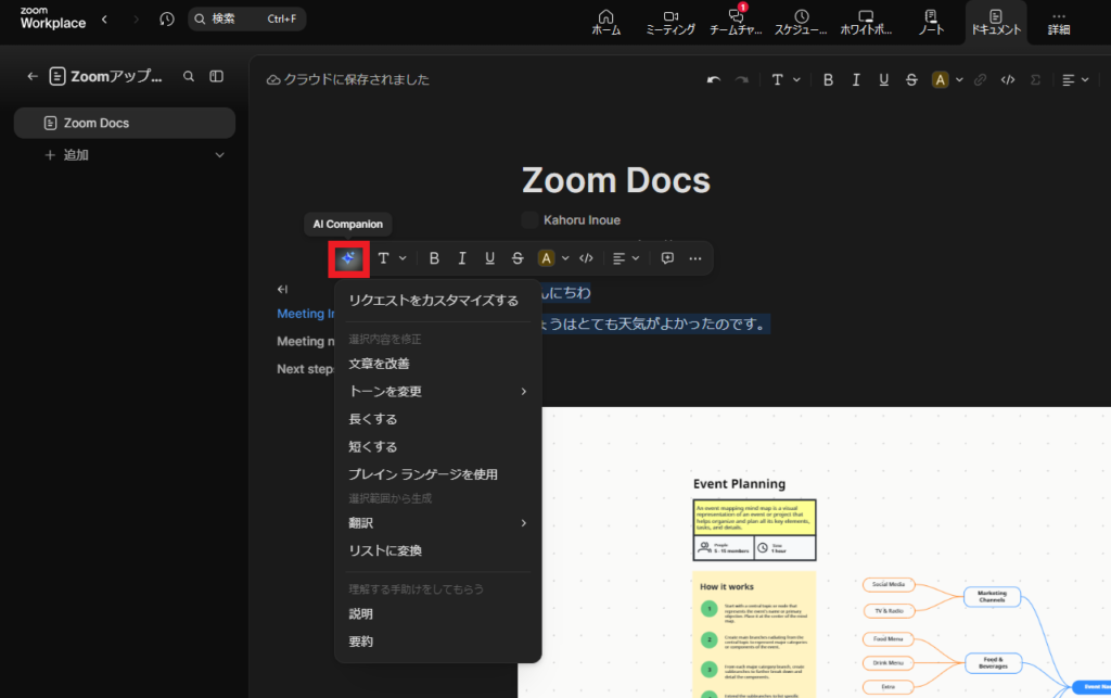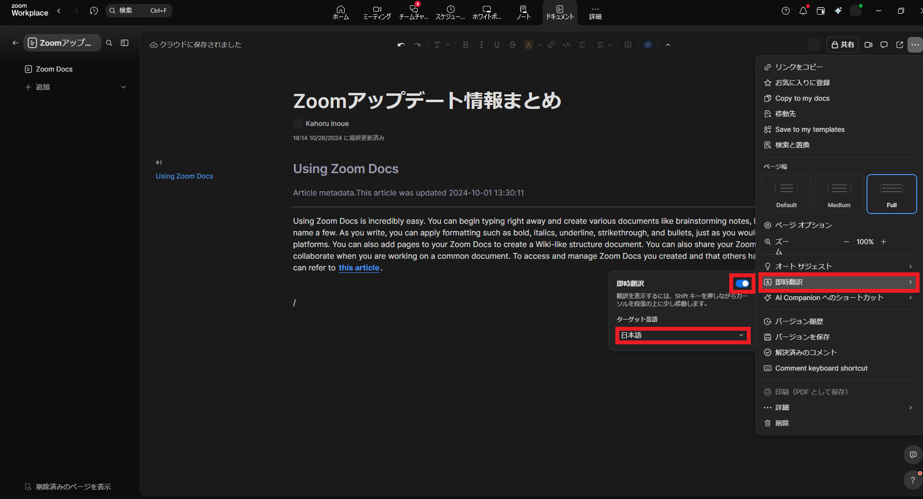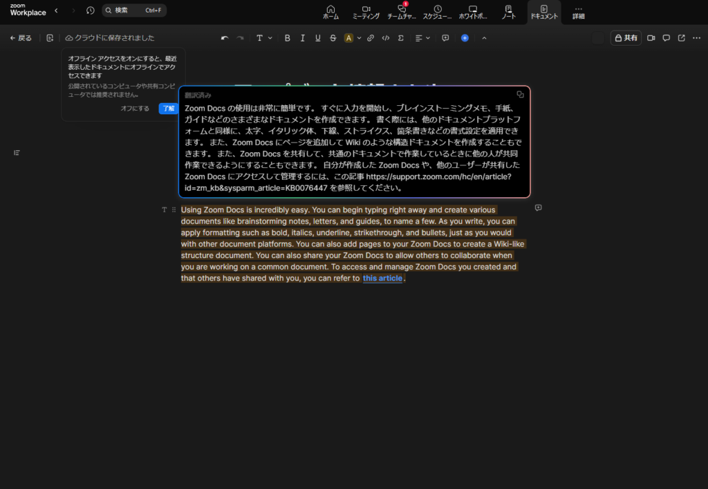 これまで別のサイトやソフトを使用していた翻訳作業がZoom Docs内で完結できるようになり、作業効率が大幅に向上しそうです。