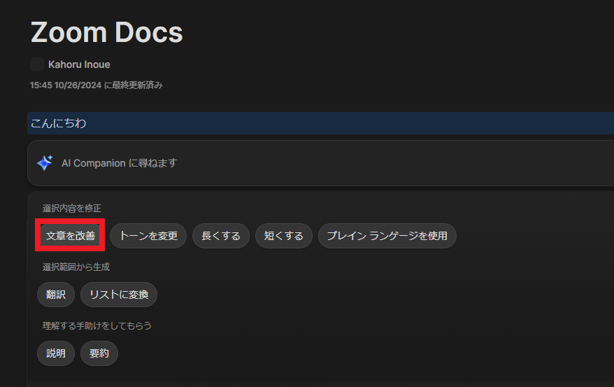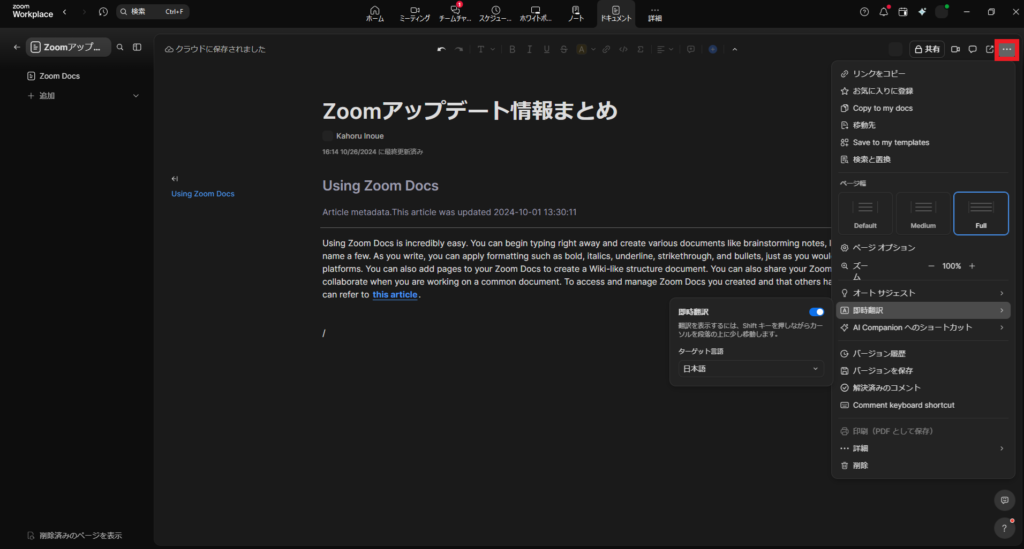 筆者の場合、これまではテキスト作成にGoogleドキュメントを使用し、Zoomのアップデート情報を確認する際は、自動翻訳で不明確な表現があれば英語に戻して別の翻訳ソフトで確認していました。しかし、Zoom Docsを使えば、テキストの作成からZoomのアップデート情報の翻訳まで、一つのツールで簡単に行えるようになるのです。