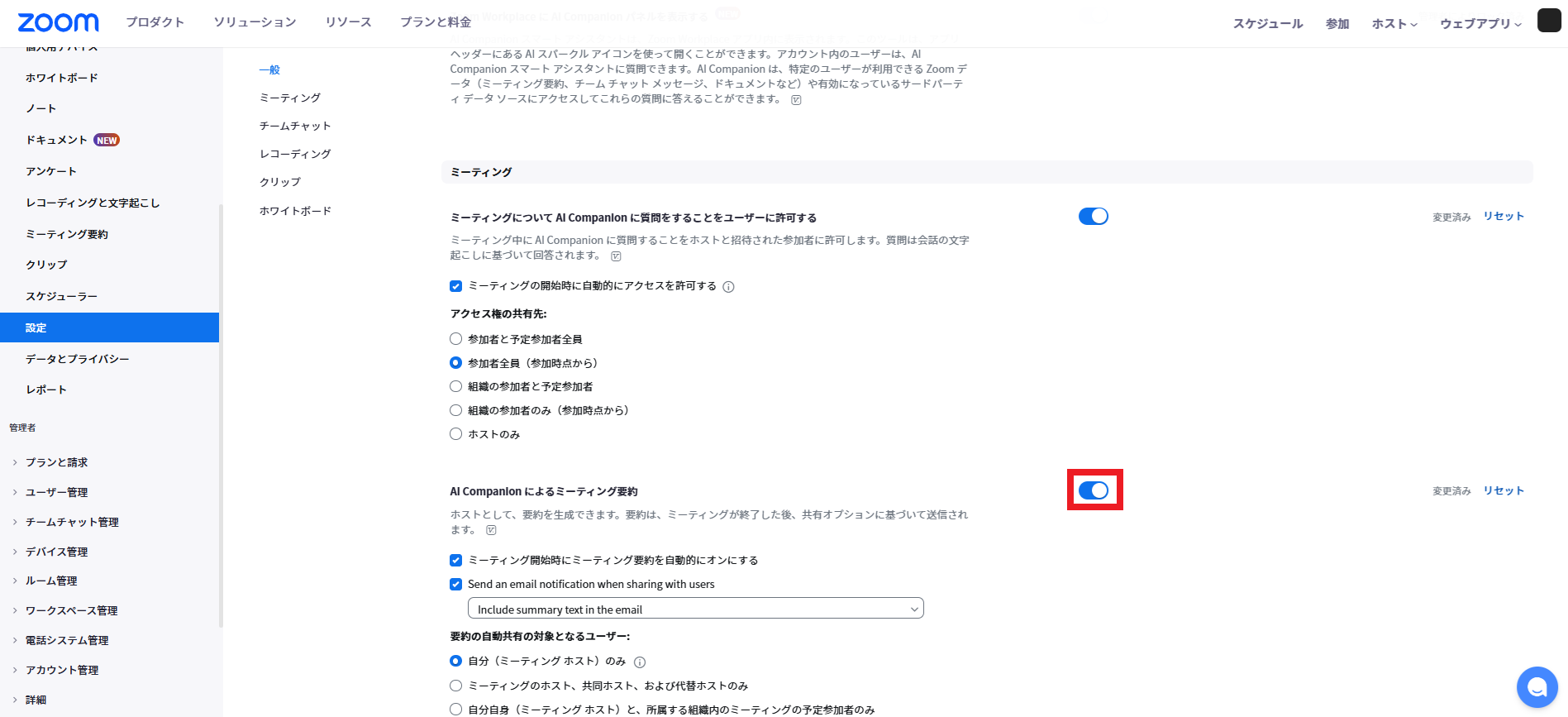 3. ミーティング要約機能を使用する場合は「AI Companionによるミーティング要約」をオン