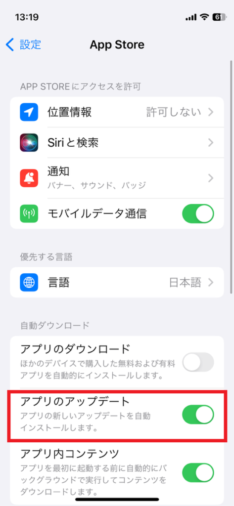– iOS: [設定] > [App Store] > 自動アップデートをオン