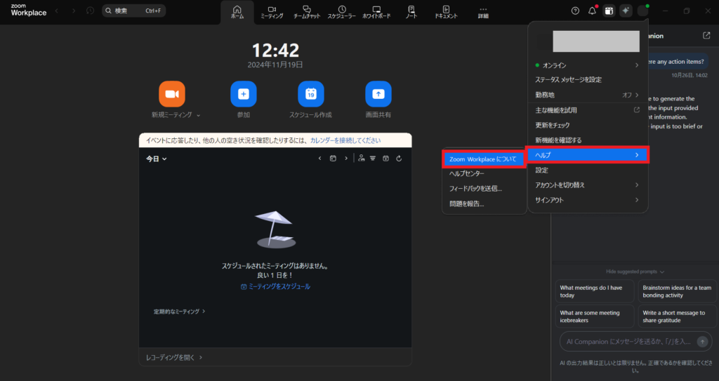 3. [ヘルプ] > [Zoomについて]を選択