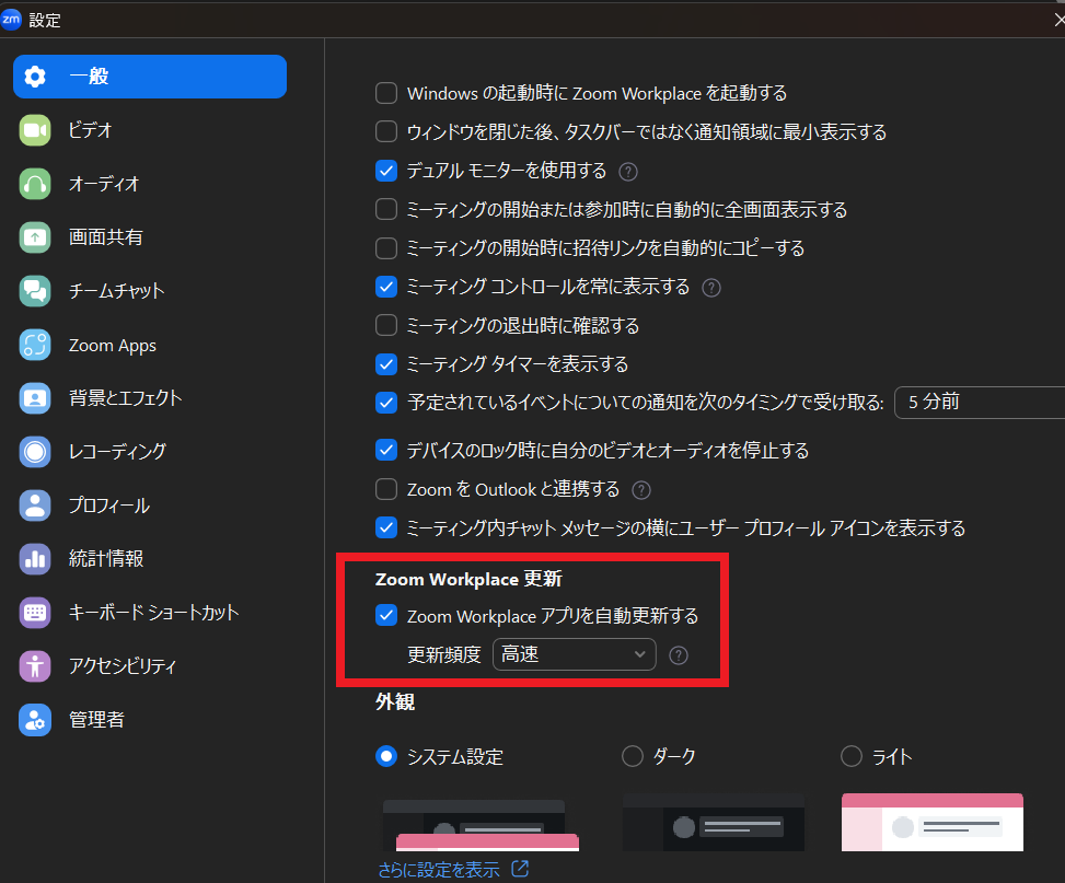 – 「Zoomを自動的に最新の状態に保つ」にチェック